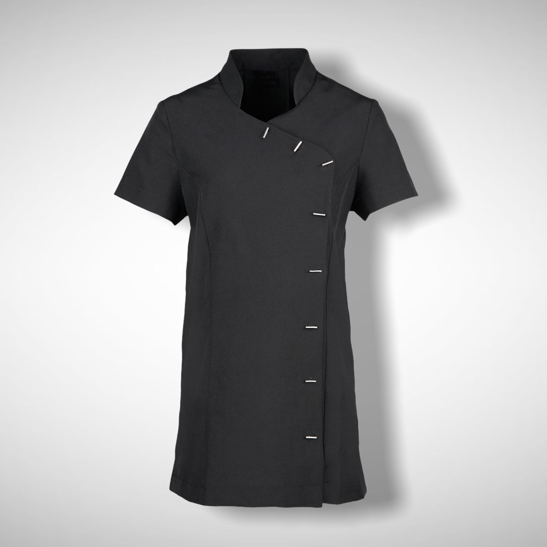This popular 'Orchid' tunic is available in fourteen colours and features an asymmetric design with eight 'bar' buttons down the front. The side vents and princess seams create a flattering fit whilst the short sleeves and back pleat allow complete ease of movement. A great uniform solution for salon staff who need to look co-ordinated.